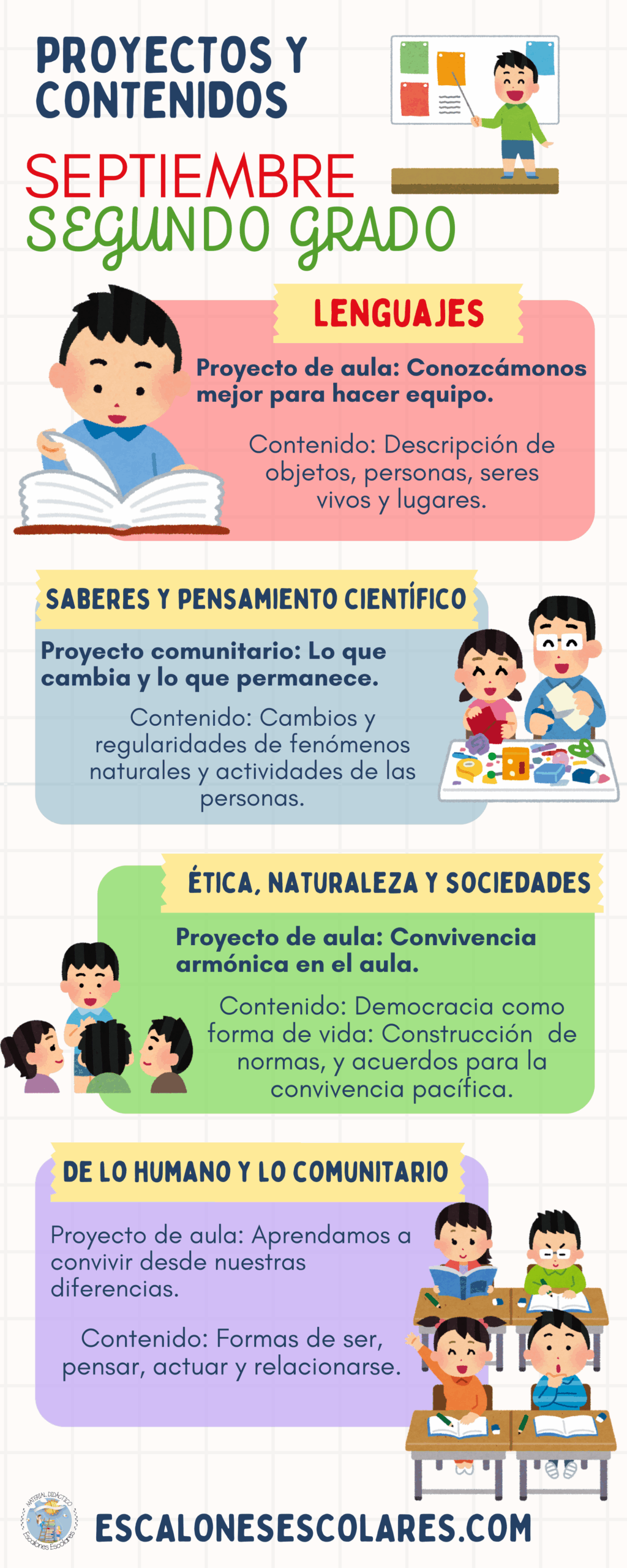 Cuenta con material de apoyo visual, cuadernillo de Múltiples Lenguajes y actividades de Conocimiento Matemático.